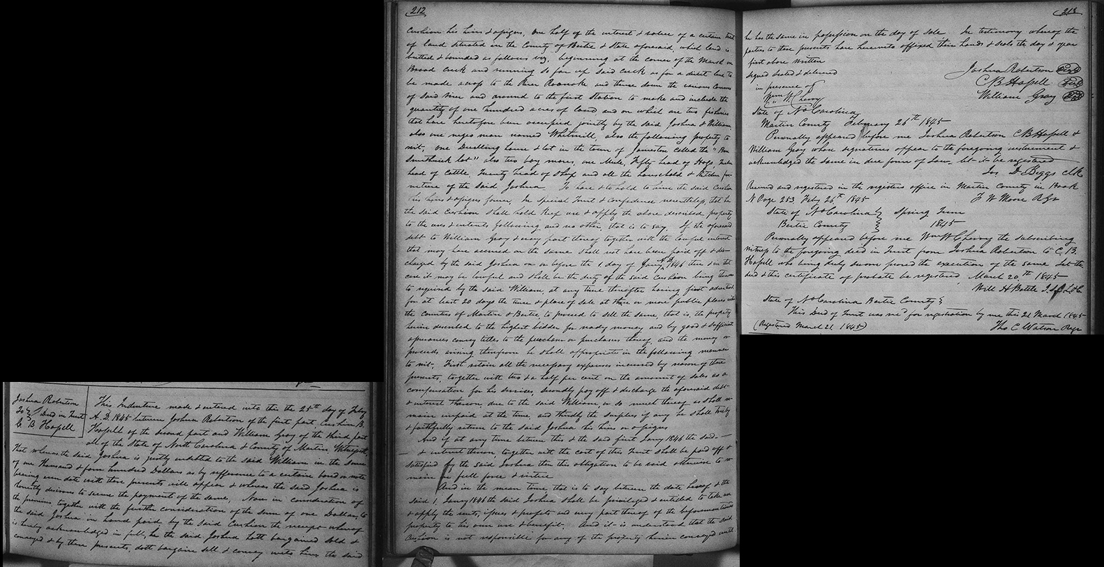 Deed in Trust. Joshua Robertson owes William Gray $1400, with interest, in a promissory note due January 1, 1846. To secure payment, Robertson puts what sounds like much of his possessions in Trust with Cushion B. Hapell (Kassell?. Included in the list of property was “one negro man named Whitmill”. Robertson and Gray jointly owned a fishery, and Robertson is conveying his half interest, along with cattle, sheep, hogs, furniture, etc. to the Trustee. Perhaps Whitmill worked at the fishery. After January 1, 1846, if Gray requests it, the Trustee is authorized to sell property to pay off the debt, and return the rest to Robertson. Document says it has a signing date of July 25, 1845, was presented in Court and registered February 26, 1845. Also, the clerk refers to Robertson as “Joshua Lott” in the text, a clear error, so he wasn’t paying attention to details.