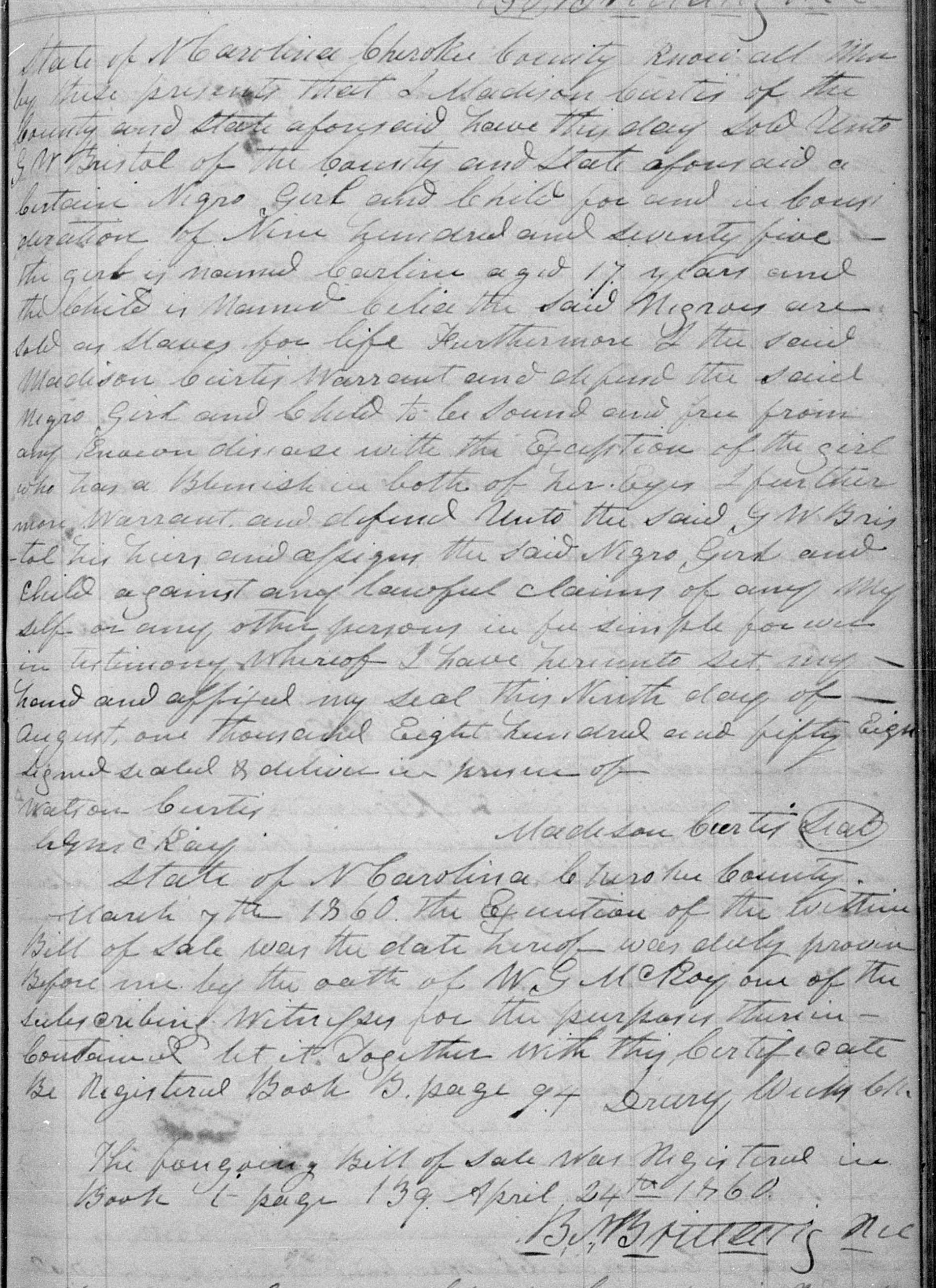 Madison Curtis sold a negro girl Caroline and a child Celia to G. W. Bistol for $975
