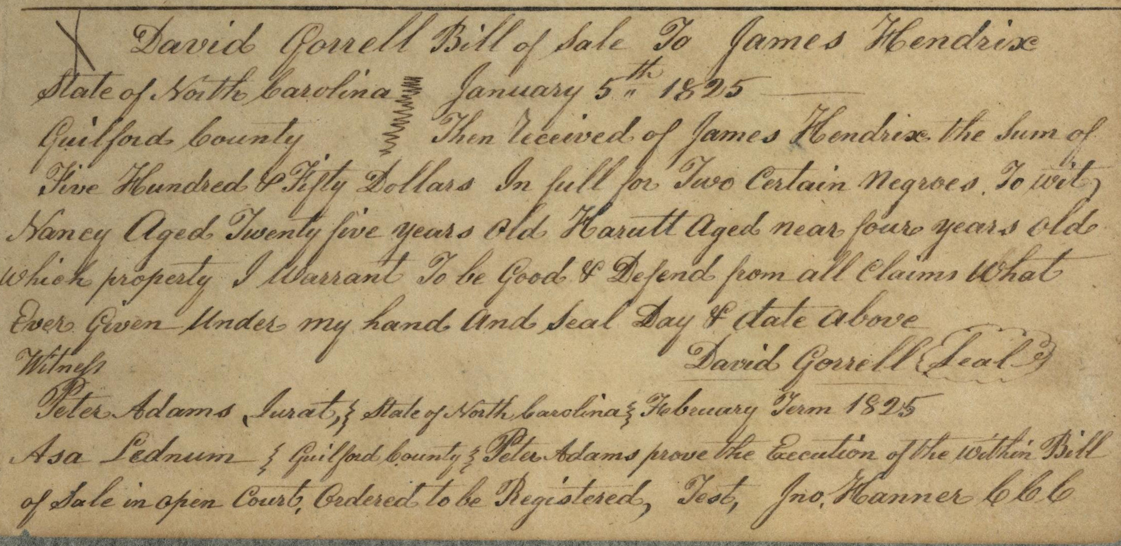 Know all men, that we John W. Caldwell and Robert Caldwell having obtained from Capt. Adam Scott a bill of sale for a negroe woman Ead and her child Charles, for the sum of Three hundred and seventy-five dollars; and whereas we the said J.W.C and R.C. having made the payment of the above mentioned three hundred and seventy five dollars out of the funds of the Rev.'d David Caldwell our father now deceased. We now by these presents relinquish any right to said Negroe woman and her child Charles, and a young child which she has since had, which might be derived from our purchase of said Negroe Woman Ead, and from the Bill of Sale which we obtained from said Adam Scott and by these presents do release these above named Negroe Woman and children to be subject to the directions of the last Will and Testament of our Father, now deceased - as Witness our hands and seals the day and year above written.