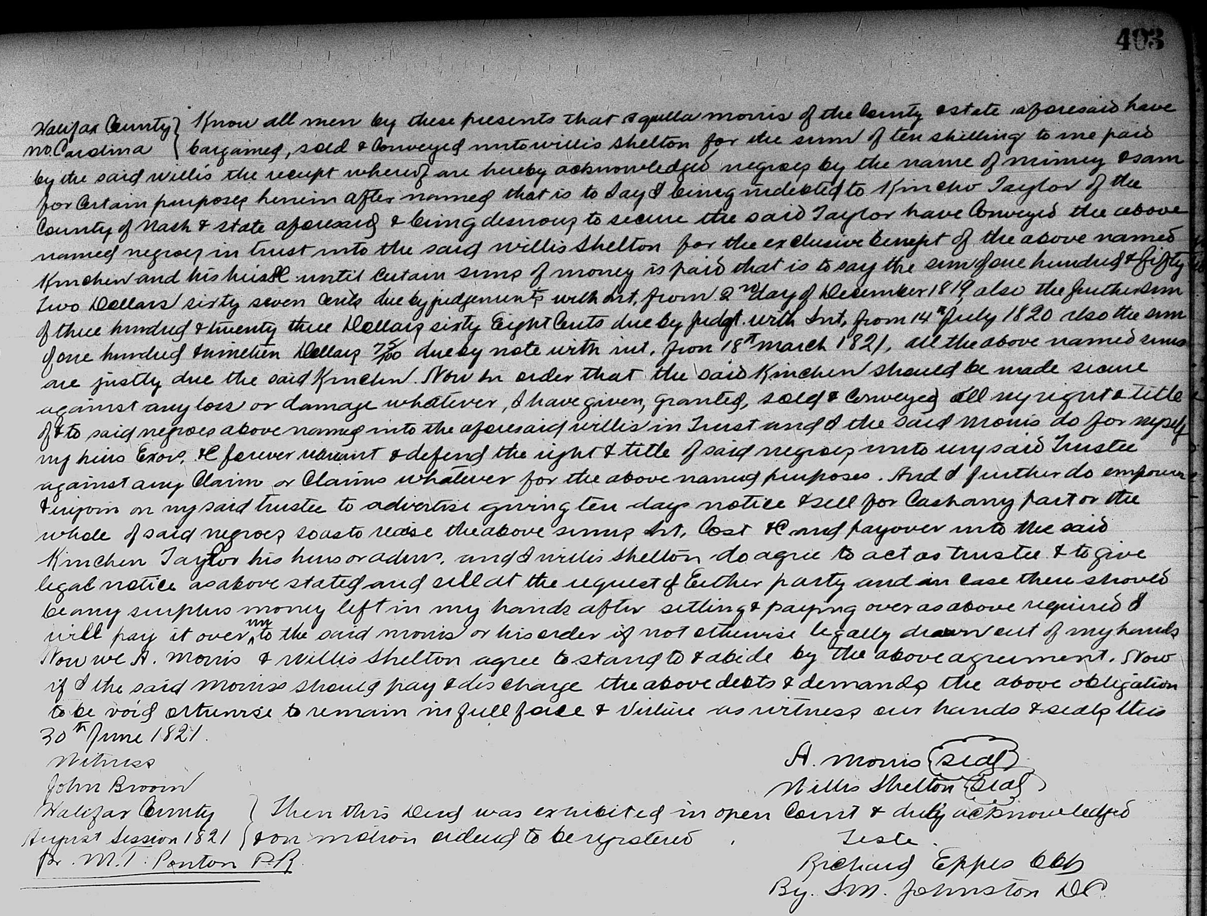 Aquilla Morris holds enslaved Mimey Osam as collatoral (10 shillings) for Willis Shelton. Willis Shelton is indebted to Kimchen Taylor for $452.67