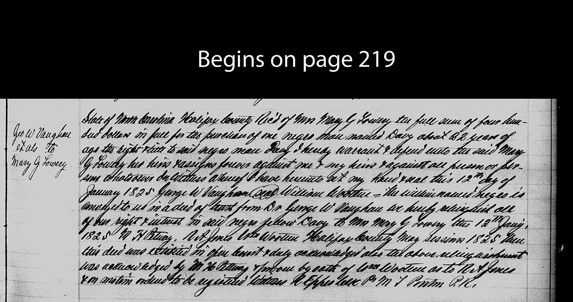 George W Vaughan sells enslaved 22-year-old man Davy, obtained in a deed of trust from Dr George W Vaughan, to Mary G Lowery for $400