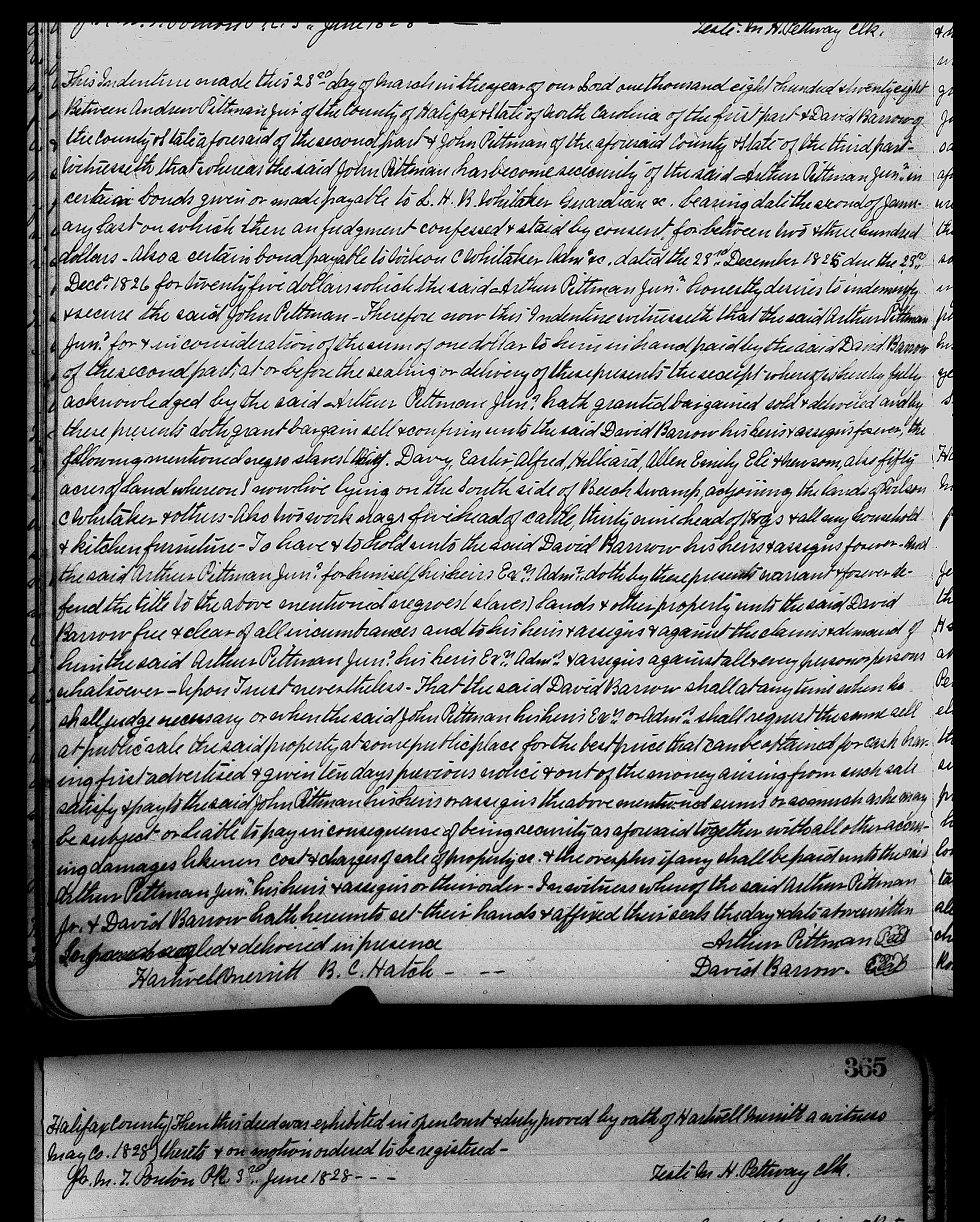 Andrew Pittman Jr uses enslaved Davy, Easter, Alfred, Hilliard. Allen, Emily, Eli and Newsom as part of collateral for debts secured by David Barrow for $1