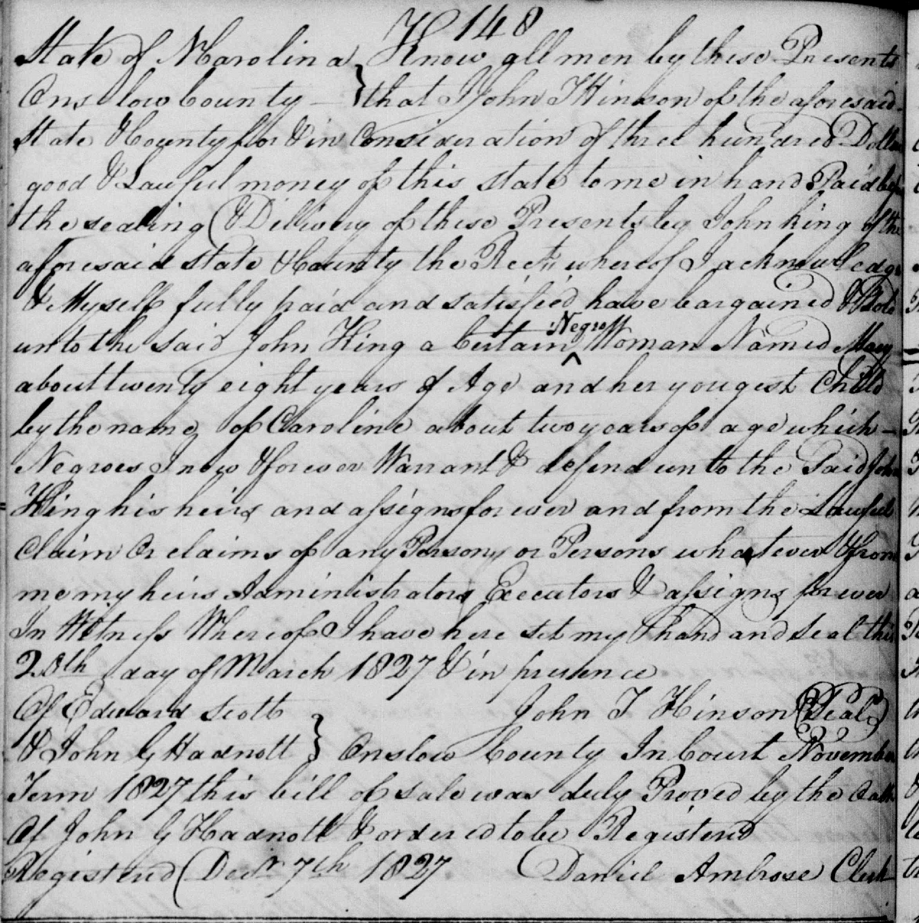 John T. Hinson sells enslaved 28-year-old mother Mary and her youngest child, 2-year-old Caroline, to John King