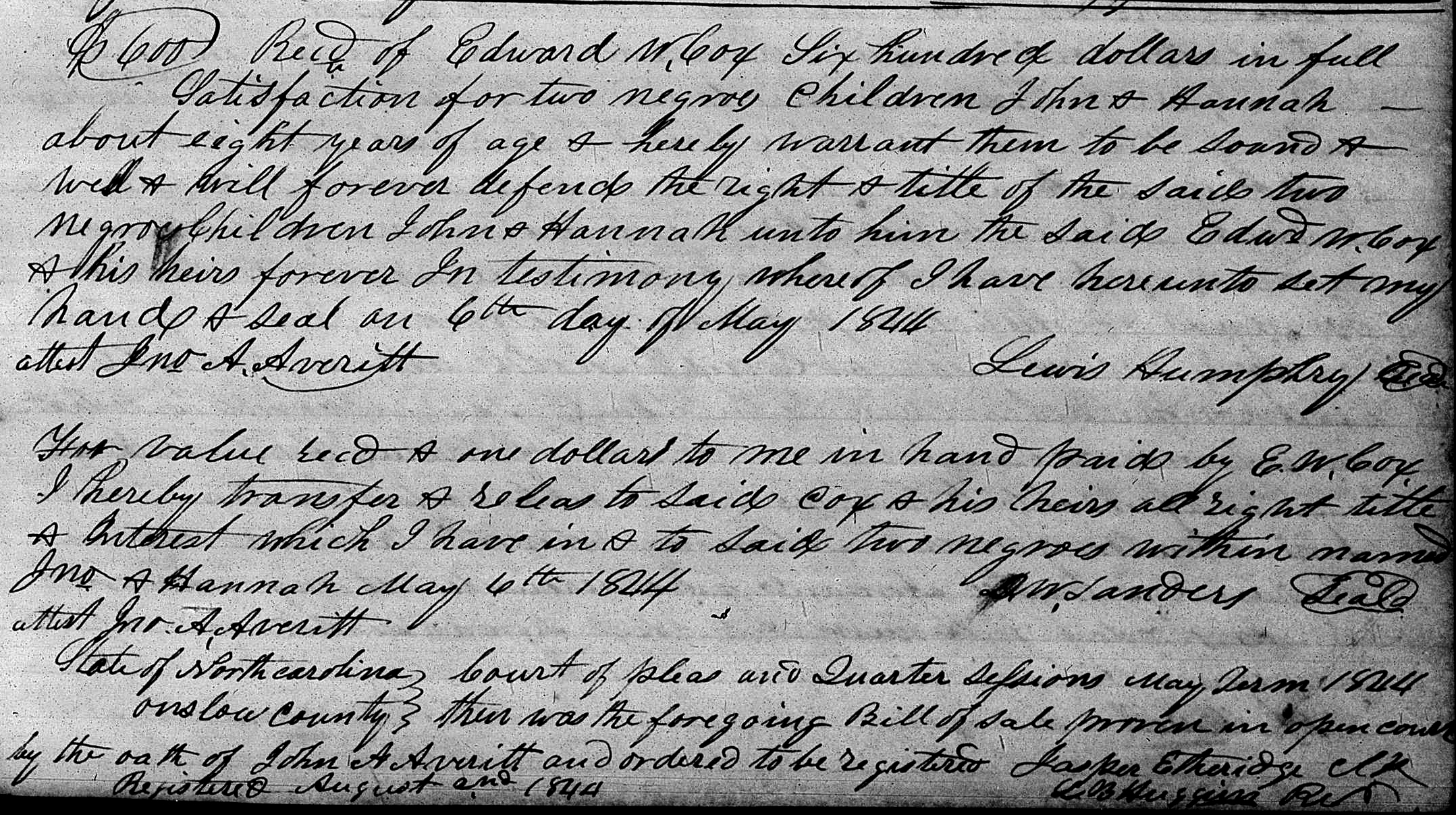 Lewis Humphrey sells enslaved 8-year-old John and Hannah to Edward W. Cox