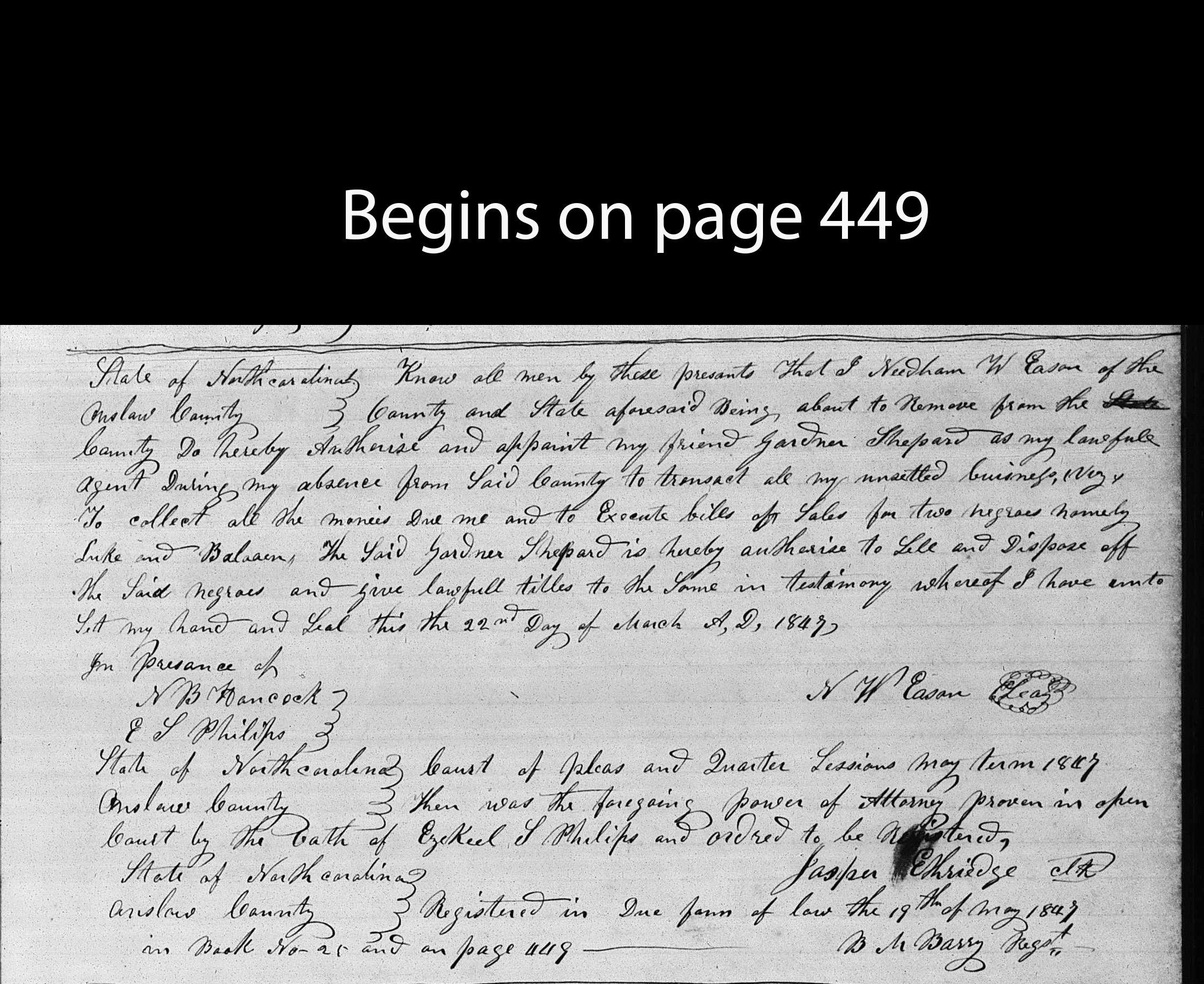 Needham W. Eason, about to leave Onslow Cunty, NC, arranges for Gardner Shepard to sell enslaved Luke and Balaam to someone