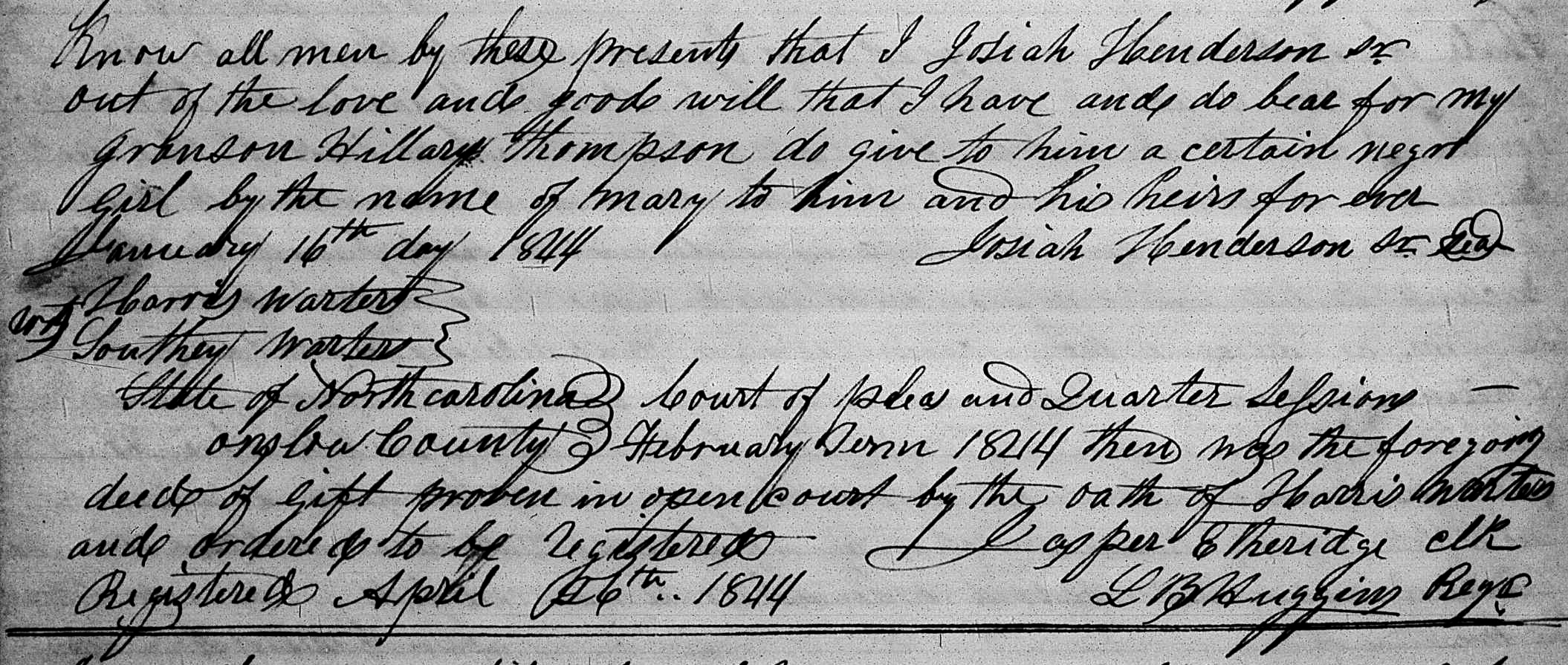 Josiah Henderson Sr. gives enslaved girl Mary to grandson Hillary Thompson