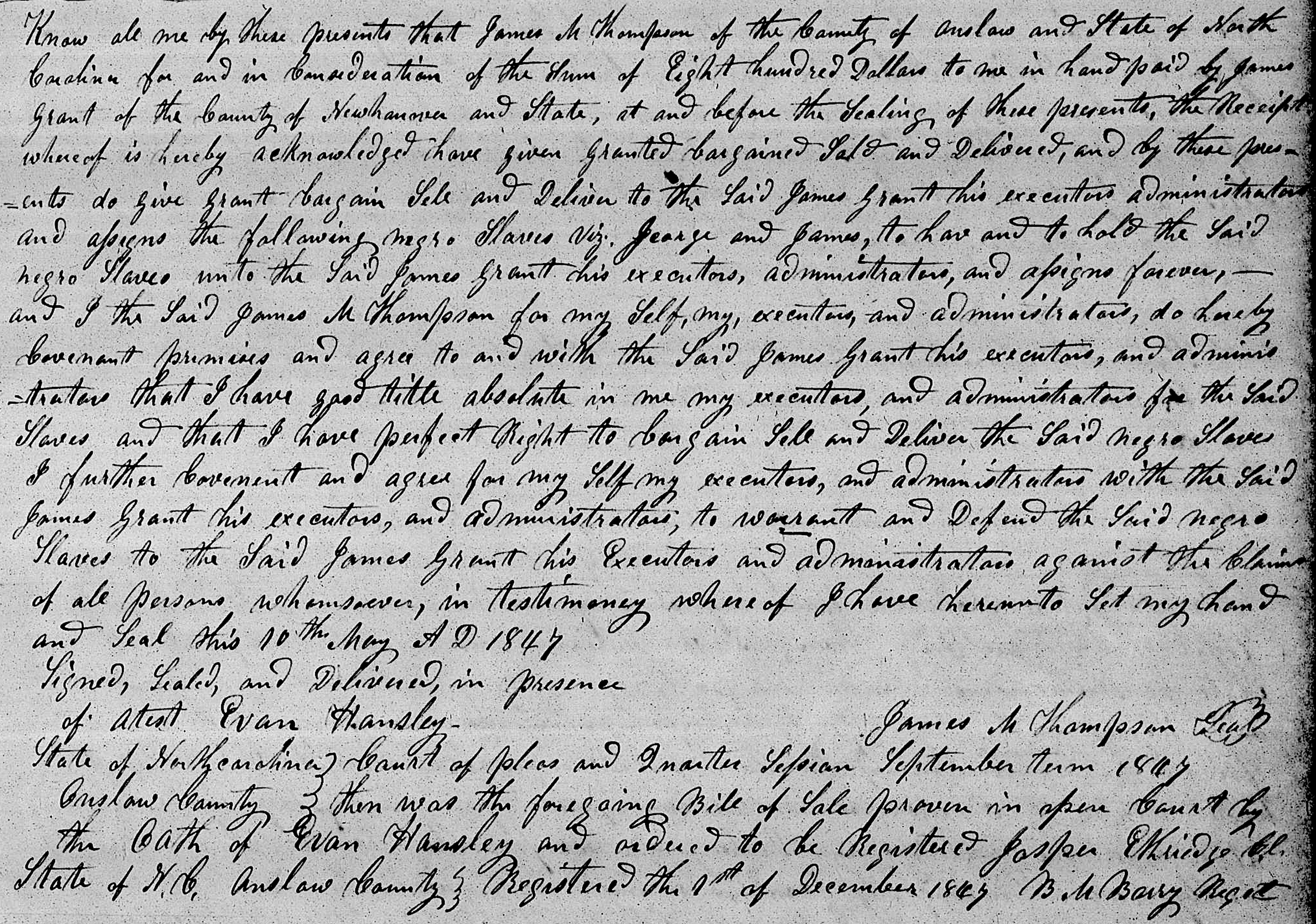 James M. Thompson sells enslaved George and James to James Grant of New Hanover County, NC