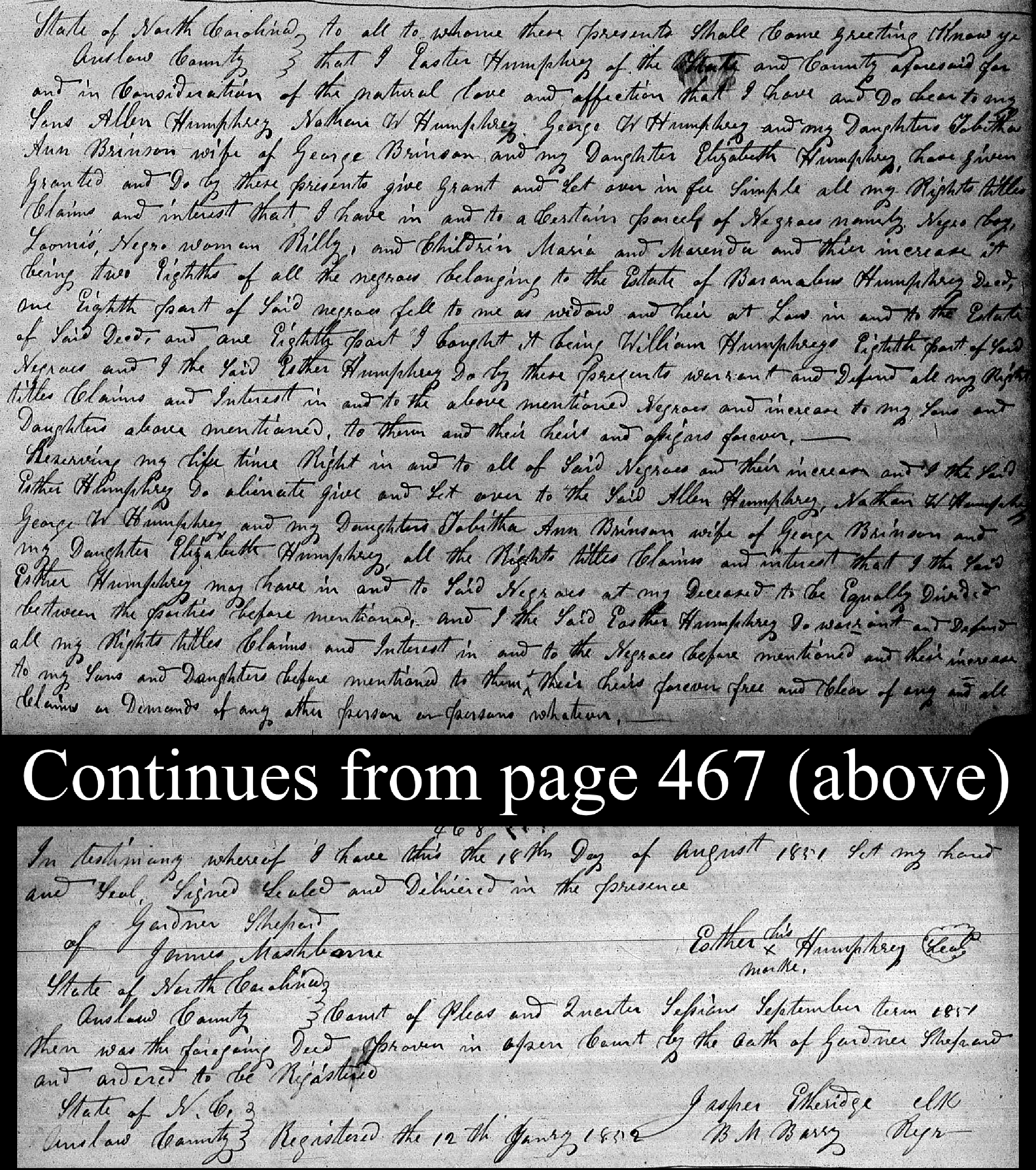Easter/Esther Humphrey gives his1/8 ownership of enslaved boy Loomis, woman Rilly, and children Maria and Marenda, inherited from Barnabus Humphrey, to Allen Humphrey, Nathan W. Humphrey and Geoorge W. Humphrey, and daughters Tabitha Ann Brinson, wife of George Brinson, and Elizabeth Humphrey