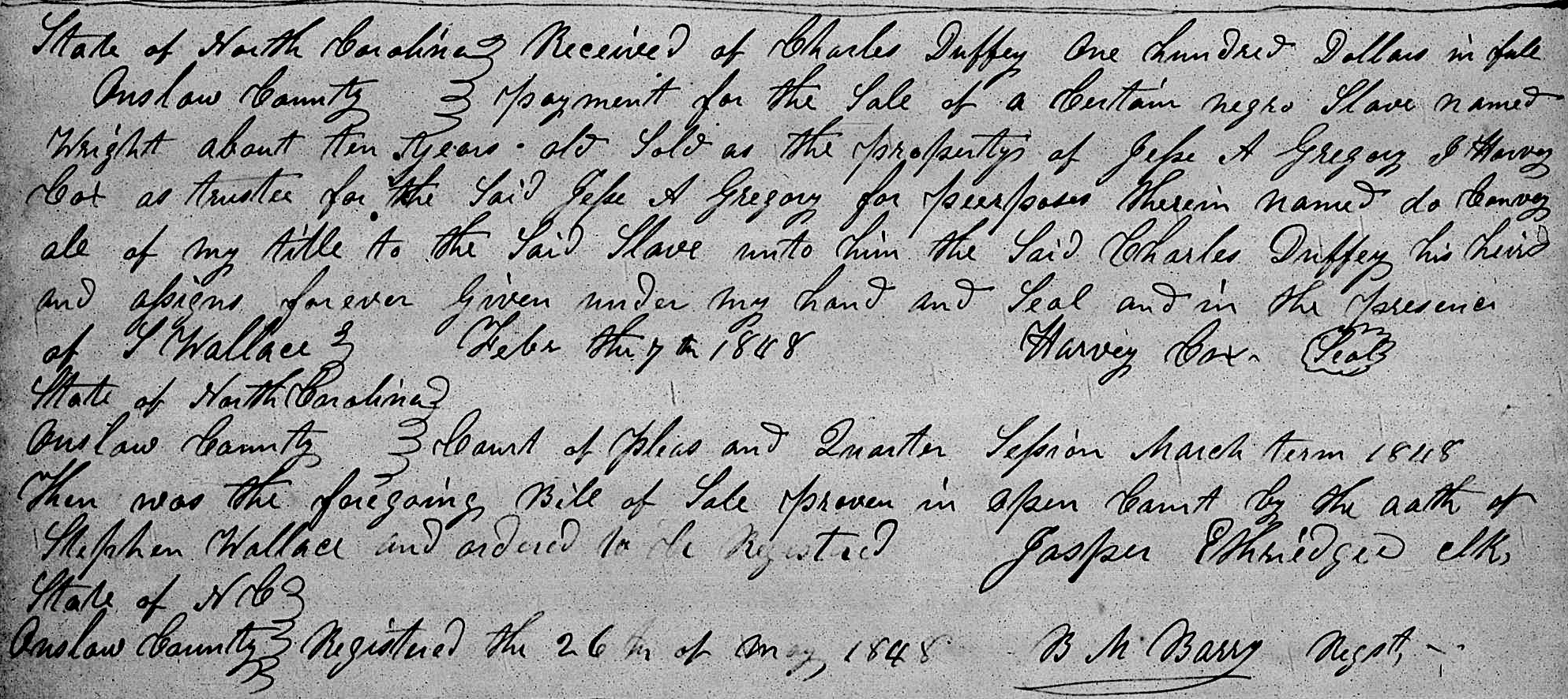 Jesse A. Gregory, through trustee Havey Cox, sells enslaved 10-year-old Wright to Charles Duffey