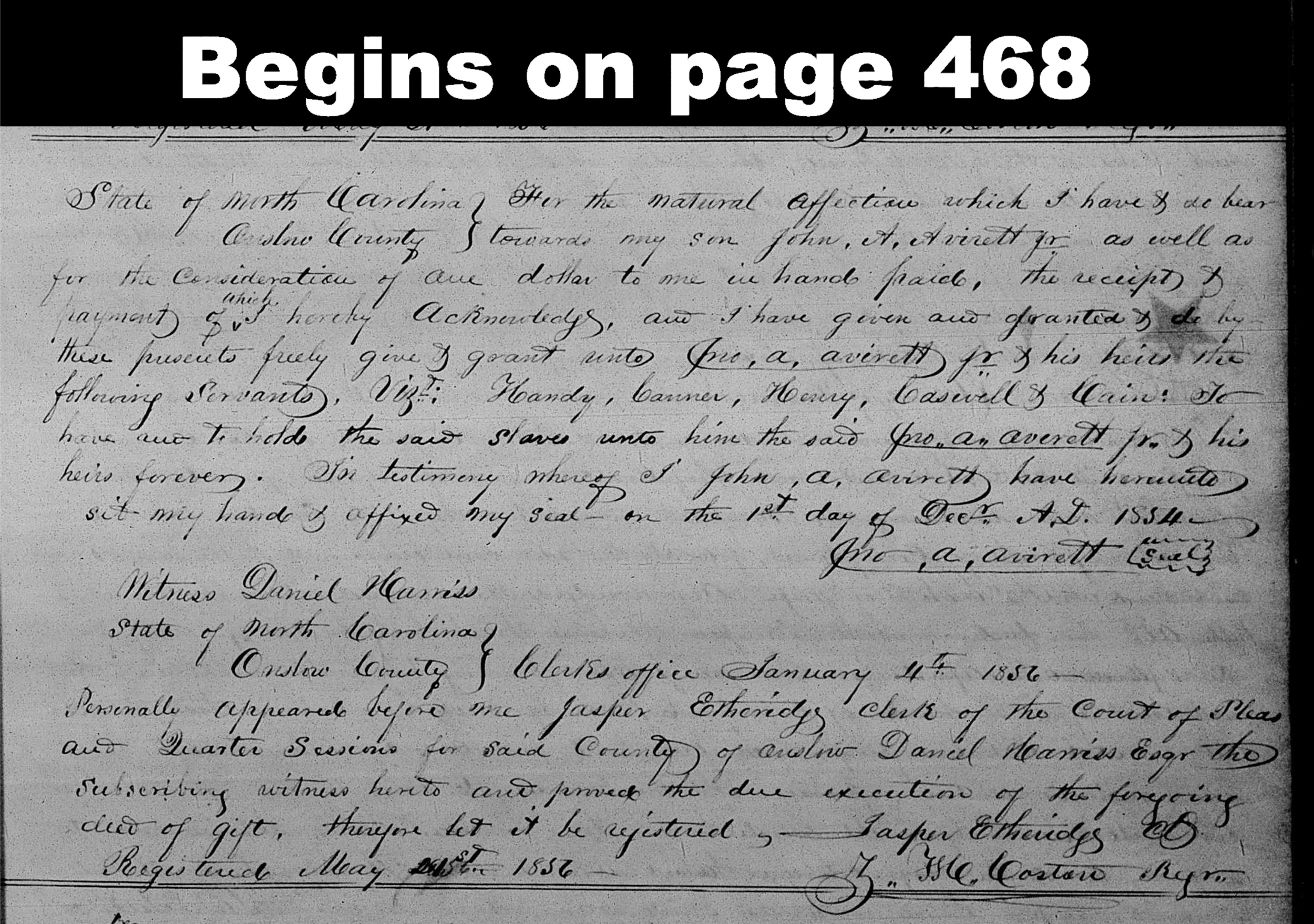 John A. Avirett gives enslaved Handy, Canner, Henry, Caswell and Cain to son John A. Avirett, Jr.