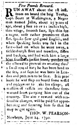 Five Pounds Reward. RUN AWAY about the 1st inst. from on board the brig. Young, Capt. Scott at Washington, a Negro man named John, about 25 years of age, about 5 feet 10 or 11 inches high, thin visage, smooth face, lips thin for a negro, nose rather prominent than flat, speaks slow and good English, and when speaking looks you full in the face--had on when he went away, a ticklenburgh shirt and trowsers, shoes and buckles, and had with him a large blue seaman's jacket lined, patches on the elbows to prevent its wearing thro' a small round hat; he has been bred to the sea, and says he was born in London and pretends to be free. It is probable he will ship on board some vessel and endeavour to make his escape, all masters of vessels are therefore forewarned from carrying him ot of the country. The above reward with reasonable charges, will be paid for apprehending and securing him so that he may be got again. THO.[THOMAS] W. PEARSON. Newbern, June 27, 1790.