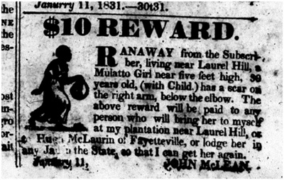 $10 REWARD. RANAWAY from the Subscriber, living near Laurel Hill, a Mulatto Girl near five feet high, 39 years old, (with Child,) has a scar on the right arm, below the elbow. The above reward will be paid to any person who will bring her to myself at my plantation near Laurel Hill, or to Hugh McLaurin of Fayetteville, or lodge her in any Jail in the State, so that I can get her again. January 11, JOHN McLEAN.