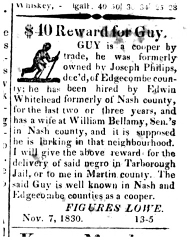 $40 Reward for Guy. GUY is a cooper by trade, he was formerly owned by Joseph Philips, dec'd, of Edgecombe county; he has been hired by Edwin Whitehead formerly of Nash county, for the last two or three years, and has a wife at William Bellamy, Sen.'s in Nash county, and it is supposed he is lurking in that neighbourhood. I will give the above reward for the delivery of said negro in Tarborough Jail, or to me in Martin county. The said Guy is well known in Nash and Edgecombe counties as a cooper. FIGURES LOWE. Nov. 7, 1830. 13-5