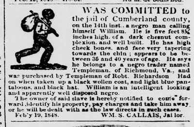 WAS COMMITTED to the jail of Cumberland county, on the 14th inst. a negro man calling himself William. He is five feet 8 1/2 inches high, of a dark chestnut complexion, and well built. He has high cheek bones, and face very tapering towards the chin; appears to be between 35 and 40 years of age. He says he belongs to a negro trader named Templeman, of Richmond, Va., and was purchased by Templeman of Robt. [Robert] Richardson. Had on when taken up a black wollen coat, and light blue pantaloons, and black hat. William is an intelligent looking and apparently well disposed negro. The owner of said slave is hereby notified to come forward, identify his property, pay charges and take him away, or he will be dealt with as the law directs in such cases. Feb'y 19, 1848. WM. [William] S. CALLAIS, Jailor.