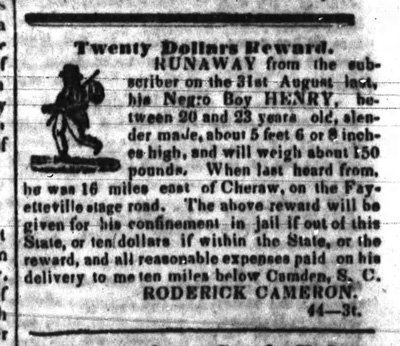 Twenty Dollars Reward. RUNAWAY from the subscriber on the 31st August last, his Negro Boy HENRY, between 20 and 23 years old, slender made, about 5 feet 6 or 8 inches high, and will weigh about 150 pounds. When last heard from, he was 16 miles east of Cheraw, on the Fayetteville stage road. The above reward will be given for his confinement in jail if out of this State, or ten dollars if within the State, or the reward, and all reasonable expenses paid on his delivery to me ten miles below Camden, S. C. RODERICK CAMERON. 44--3t.