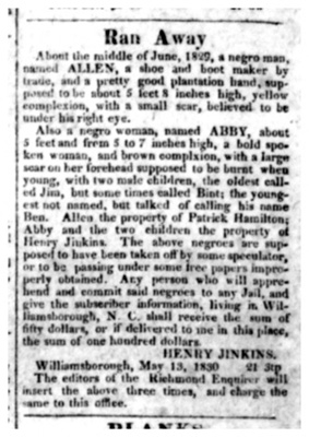 Ran Away About the middle of June 1829, a negro man, named ALLEN, a shoe and boot maker by trade, and a pretty good plantation hand, supposed to be about 5 feet 8 inches high, yellow complexion, with a small scar, believed to be under his right eye. Also a negro woman, named ABBY, about 5 feet and from 5 to 7 inches high, a bold spoken woman, and brown complxion[sic], with a large scar on her forehead supposed to be burnt when young, with two male children, the oldest called Jim, but some times called Bint; the youngest not named, but talked of calling his name Ben. Allen the property of Patrick Hamilton; Abby and the two children the property of Henry Jinkins. The above negroes are supposed to have taken off by some speculator, or to be passing under some free papers improperly obtained. Any person who will apprehend and commit said negroes to any Jail, and give the subscriber information, living in Williamsborough, N.C. shall receive the sum of fifty dollars, or if delivered to me in this place, the sum of one hundred dollars. HENRY JINKINS. Williamsborough, May 13, 1830 21 3tp The editors of the Richmond Enquirer will insert the above three times, and charge the same to this office.